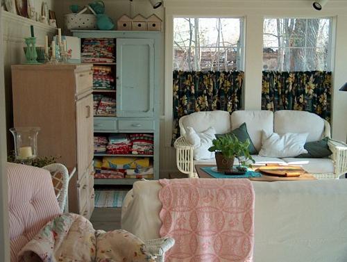 The cupboard with the linens is one I got from a garage sale....I just washed it and put it in...I love the old paint and the color is perfect....it shows off my 40's tablecloths pretty well.