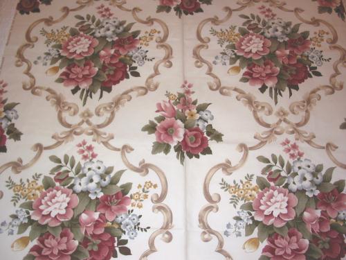This is a gorgeous vintage fabric. It is a medium weight cotton and showcases large pink rose and floral bouquets in tan colored scrolls. The background is a cream or ivory tone. The selvage is printed with "Design Hurndall Guaranteed Vat Prints". This is in very good, unused, unwashed, clean condition. A few surface dirt scuffs and very slight attic smell, but not offensive. Price is per yard.