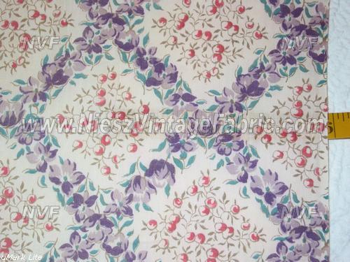 Description: This is a light weight cotton fabric dating to the 1930-40's. Slightly sheer. Small coral colored berries are clustered among purple violets. Very good unused yardage. No holes, stains, or fading. Price is for a piece that measures selvage to selvage 34.5"W x 33"L.