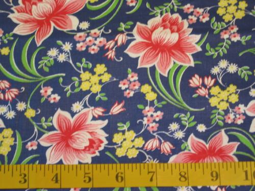 Description: This cheery floral vintage fabric dates to sometime between the 1940's and 1960's. (I wish I could pin it down better, but the colors are throwing me). It is a medium weight and feels like a coated cotton fabric of some sort. Bright red, pink, and yellow flowers are striking against the navy blue background. Excellent, unused, unwashed, clean condition. There is a small remnant of a sticker at one corner and a white line print flaw that's 27" long. Selvage to selvage width is 36". Price is for a piece that measures 3 yards long.