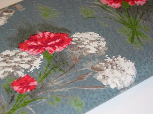 This is vintage dress weight fabric from the 1950-60's. It is a lovely embossed fabric, a rayon/cotton blend I believe, but can't say for sure. Fiber burn test results: burns completely to soft ash. It features a painterly floral design of pink, red, and white carnations on a slate blue-grey background. Very good unused yardage. Selvage to selvage width is 34" inches. Price is for a piece 4 yards long.