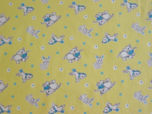 Description: This is a sweet vintage juvenile fabric. It is a quilt weight cotton featuring elephants, ponies, and bunnies wearing aqua bows on a pastel yellow ground. There are also little aqua and white daisies scattered throughout.
